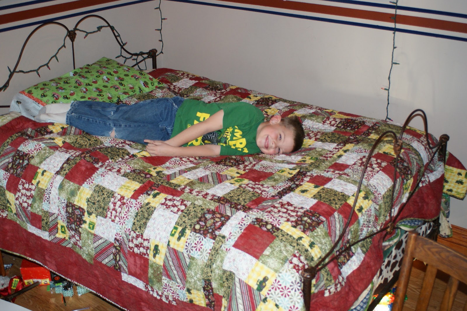 This Christmas quilt for Nathan is the result of a Dozen Quilters. I designed the blocks and sent out fabric and each lady sent me back a block which is now Nathan’s quilt. Just a little late for this Christmas, but still . . .