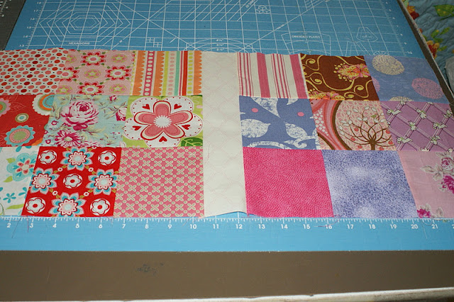 Sew your blocks together, putting strips between each one in the rows your have chosen. Do this for each row.