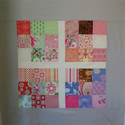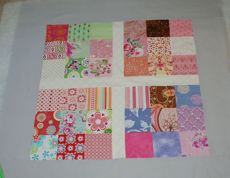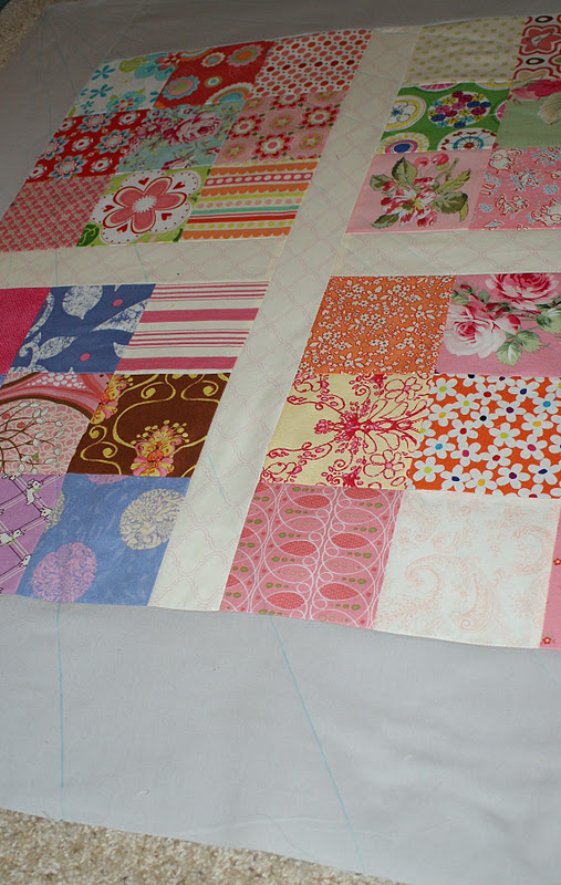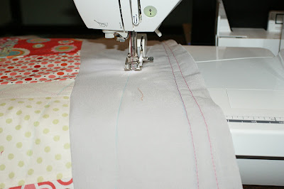 Choose a thread color, either something that will blend in or something that will stand out. I chose a bright pink to contrast with the gray and complement all the pinks in the quilt. Sew down the lines you marked with the pen.