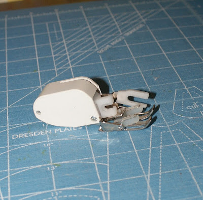 Now if you own a foot kind of like this, called a walking foot, go ahead and attach it to your machine. If you don’t own one, your regular open toe foot will probably work just fine. After all, we fused this baby together pretty well. The walking foot helps keep the same tension on the top fabric as the feed dogs keep on the bottom fabric.